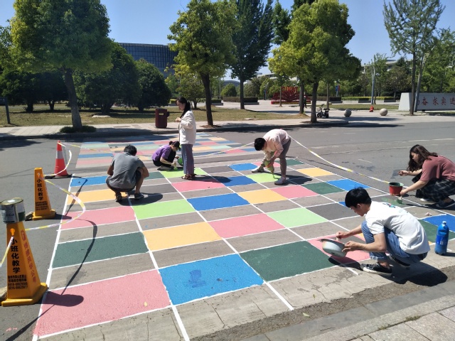 为了工作的顺利完成,心理自助中心做了充分的准备工作,从绘画颜料的调制到场地的清扫与处理的每一个环节都进行了细致的任务分工。同时,在校保卫处的支持下,工作人员对绘制区域进行了维护,在不影响马路正常通行的前提下,进行彩色斑马线绘制。为了提高效率,防止颜料混合,心理自助中心部员们首先使用胶带将采用的图形进行了规划定型。绘制过程中,大家按照规定好的区域,各司其职,小心翼翼地比照着图纸将颜料涂抹在各自的对应区域。艳丽的色彩、充满创意的设计、认真投入的身影吸引了众多同学驻足观看。来来往往的同学们不时发出赞叹,感叹昔日普通的斑马线现在变得如此绚丽。为了保证校园道路的正常通行,5月21日下午心理自助中心开始实施半边彩绘,5月22日下午继续进行另外一半的彩绘。历经八小时的绘制,在5月22日下午5点,矿大校园内的彩色斑马线终于绘制完成。