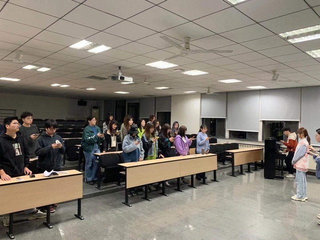 排练现场上,班长及各班委相互配合,两名指导同学简要概述排练内容。活动以熟悉乐谱、练前开嗓、钢琴奏乐三部分展开,现场气氛活跃,大家相互配合,伴随奏乐一遍遍的认真练习。