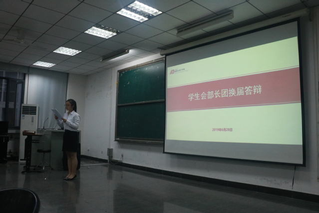换届答辩大会于19点准时开始。本次答辩分为PPT讲解以及评委提问两个环节,答辩按照联合办公室、体育部、文艺部、女生部、生活权益部、宣传部、学习部、外联部的顺序进行。答辩前,同学们都对自己要竞选的职位有了清楚的认识及明确的规划,并进行了认真的准备。在答辩过程中,同学们均着正装,依次上台进行PPT讲解展示,时间控制在三分钟以内。同学们对过去一年的工作进行了总结,分享了在过去一年中的感悟与收获,阐述了自己的竞争优势,展示了未来工作的思路。随后,评委们结合同学们的讲解以及各个部门的工作特色进行提问,竞选者们结合具体的工作事例详细认真地回答了老师的问题,有条不紊,思路清晰,获得了老师及主席团的认可。答辩结束后,全体与会人员拍摄合照留念。