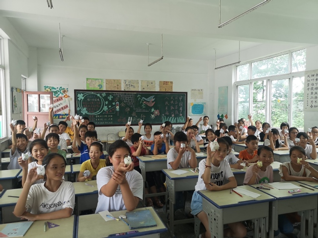 在音乐课堂上,孩子们充分展现出童真的一面。当支教同学问起喜欢的歌曲时,大家纷纷举手,踊跃回答,回答的内容体现出孩子们接受新事物的能力。同时,韩磊、薛达两位同学还带领了孩子们进行了歌曲学习。在二年级的课堂上,韩磊同学带领孩子们学习了《让我们荡起双桨》这首歌,没过多久,悠扬的歌声就回荡在整个教室。同时在一年级的课堂上,孩子们也很快学会了《虫儿飞》这首歌,演唱中充分展现出孩子们活泼、纯真的一面。四年级的同学在薛达同学的引导下了解了歌曲《闪闪的红星》背后的故事。孩子们认真听着薛达同学的讲述,同时对革命历史有了更深的了解。在美术课上,熊梦婷、章红梅两位同学带领孩子们进行了立体折纸活动。一张普通的白纸,通过自己动手折叠、绘画,变成了一个个生动形象的立体形象。看着这些亲手制作出的立体折纸,孩子们露出了灿烂的笑脸。