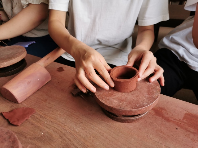 经过前期计划和准备,实践活动主要在7月13日、7月14日两天进行,分为研究溶洞和探索陶艺两部分。首先,在宜兴南部灵谷洞开展的溶洞研究中,实践团队分工明确,包括测量溶洞各处数据、收集溶洞内暗河和钟乳石样本等活动。之后,团队来到位于陶祖圣境风景区的范蠡西施陶坊。在仔细观察陶艺师傅的制陶过程后,团队成员开始亲自体验紫砂壶的制作。经过几个小时的努力,大家已经能够熟练使用各种工具,并最终制作出一个个风格独特的茶壶。
