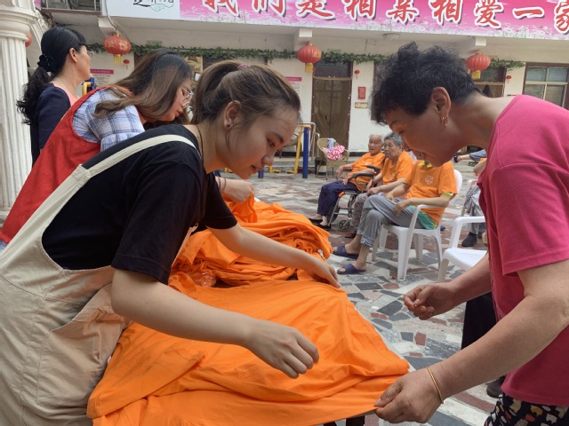 活动伊始,队员们乘坐公交车来到位于徐州市云龙区彭城街道的燎原居家养老服务中心,之后便将院子进行了清扫。在与老人们的交谈中,同学们除了了解老人们的兴趣爱好,更多的是倾听老人们的一些忧愁和烦恼,并进行心理疏导。活动结束后,志愿者们搀扶老人们回屋歇息,然后将椅子统一收起来,把院子再次仔细打扫了一遍。有位百岁高寿的老奶奶望着墙上的一张张照片,感慨万分,说:“如果说这里是一棵大树,每一位老人都是树的一个分杈,缺一不可,我们是相亲相爱的一家人。”
