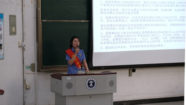 活动伊始,徐州车务段团委书记佟鑫向同学们说明了本次活动的意义,强调了铁路安全和交通安全的重要性。随后,宣讲员李昂以“铁路安全进校园”为主题向同学们详细地介绍了高铁车票的购、换、退、补等手续流程和铁路志愿服务活动,通过视频向同学们展示了铁路安全事故的危险结果,并提醒同学们乘车中要注意防盗防骗,保护好个人人身和财物安全。最后,设计学院办公室与实验教学中心党支部书记范乾坤老师作总结讲话,她介绍了党支部组成科室的职能,欢迎同学们积极咨询,增进了解,并再次强调了安全重于泰山,关键在于预防,要牢固树立安全意识和责任意识,共同构筑校园安全防线。