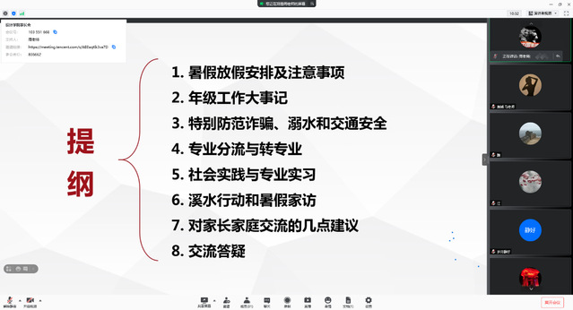 本次会议分为“暑假放假安排及注意事项”、“年级工作大事记”、“特别防范诈骗、溺水和交通安全”“专业分流与转专业”等八个部分。首先,周天涯老师对放假时间和留校要求等做了介绍,然后从核酸检测、经济困难建档、疫苗接种等多个方面向家长汇报了年级工作,让家长们对孩子的在校的学习和生活具有一定的了解。此外,周天涯老师特别强调了防诈骗、溺水和交通安全等注意事项,还告知家长学生暑期有社会实践和专业实习,以及假期的暑假家访,随后对家长提出了一些建议,如:尊重孩子意愿和选择、和孩子进行深入交流等。