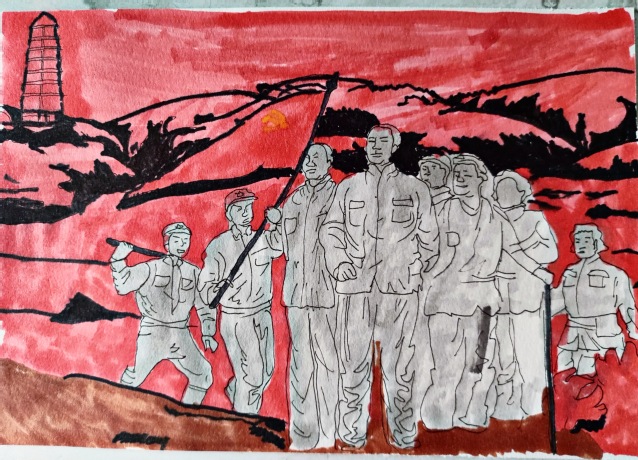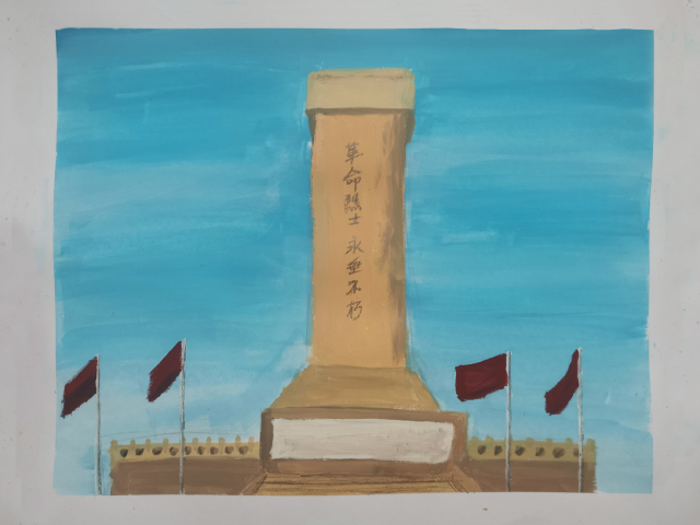 团队成员于莎莎绘画了在台儿庄战役中革命英雄英勇奋战的战斗场景。在台儿庄战役中,面对日军五万余人的强烈进攻时,中国革命英雄不畏强敌,勇往直前,为人民和国家牺牲战场也在所不辞。正是因为英雄们的英勇奋战赢得了台儿庄战役的胜利,在政治上增强了全国军民抗战必胜的信心,鼓舞了抗日军队的士气;团队成员赵伟绘画了竖立在英雄广场上的革命烈士纪念碑。在蓝天的衬托下,高耸的革命烈士纪念碑显得格外威严。碑高31.8米,碑正面“革命烈士永垂不朽”八个大字采用毛泽东同志手写体,背面刻有中央军委原副主席张震将军撰写的碑文。在纪念碑的前面,是一幅幅随风飘扬的国旗,鲜艳的红色在空中更加夺目;团队成员李嘉欣绘画了台儿庄战役中的领导者与革命者。绘画整体采用了红色为背景,与革命旗帜融为一体,表现出当时战争的残酷,但革命烈士们勇往直前的牺牲精神却永不磨灭。