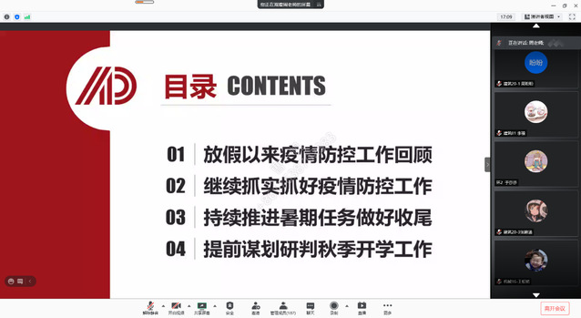 会议分为“放假以来疫情防控工作回顾”、“继续抓实抓好疫情防控工作”、“持续推进暑期任务做好收尾”和“提前谋划研判秋季开学工作”四个部分。首先,周天涯老师从本次疫情的发生及涉及地区强调了当前疫情形势依旧复杂严峻,并通过疫情中的典型案例给予同学们很多疫情防控启示。接着,周天涯老师从全面开展“两码联查”、推进疫苗接种、坚持健康打卡、加强行程摸排、防疫与防灾并重等方面对继续做好疫情防疫工作进行了布置和提醒。最后,周天涯老师特别提醒同学们要利用好假期,按时完成暑期作业和课程复习,调整状态,为新学期的线上教学做好准备。