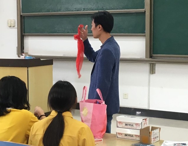 10月13日,课堂教学内容包括明日环、皮筋魔术。王涛从魔术的道具、手法进行讲解,在两个小时的教学时间里,将两种魔术逐步拆解,以手法逐步教学,并及时解答同学们遇到的问题。10月19日,通过回顾上次课程的两种道具的操作方法,大家都能够较好地掌握基础的魔术练习。该次课程末尾,该次课程还安排了个人操作展示环节,充分调动了大家的积极性。