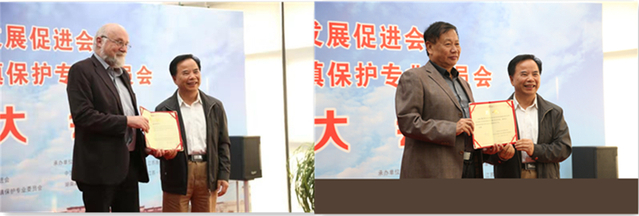 乡振委黄忠彩主任为乡振委特聘中国民居建筑大师戴志坚教授、国家住建部传统村落评审专家王金平教授、原野集团副总经理及园林专家梅相雨等五位名家为首批专家委员。