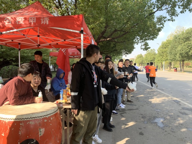 和参赛选手同样拼搏在赛场上的还有补给点工作人员。设计学院补给点主要由设计学院学生会成员组成,职责主要是为运动员提供饮用水、补充体力的食物以及基本的医疗急救必需品。为了更高效地完成志愿服务活动,工作人员在早晨7点就开始布置补给点,将所有食物、水等物资按时运送到了学院站点,为此次志愿服务做好充分的后勤保障工作。比赛进程中,补给站工作人员们恪尽职守,细心服务,为参赛选手递去补给食物、水,并且不断地鼓励呐喊,为他们加油打气。他们成为赛道旁一道亮丽的风景线。因为志愿服务人员的出色表现,设计学院补给点被选为437必赢会员中心半程马拉松比赛优秀补给点。