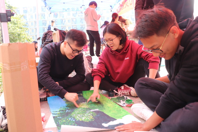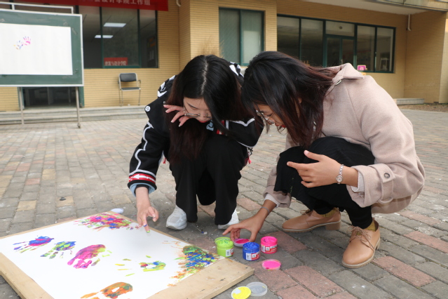 在前期的策划中,心理自助中心的成员们准备好充足的画纸、画材及清洁工具,并精心制作了以“共绘坚韧风采,精彩你我人生”为主题的活动海报及展板,通过线上线下多种方式进行广泛宣传。各部门工作人员有序组织着活动并积极参与其中。此次活动分为个人赛、团体赛以及大学生心理自助中心友谊邀请赛,个人赛按照活动要求独立完成涂鸦,团体赛要求2-4人合作完成涂鸦,在友谊邀请赛中各学院心理自助中心均可作为独立团队参与涂鸦。活动中,同学们的指尖在画纸上舞动,洒落点点颜料,通过手掌、手指、手臂来感受色彩,并结合落叶、枝丫等自然工具作为辅助画材进行创作。随着一幅幅色彩斑斓的涂鸦作品的完成,同学们也表达了自己的所思所想。现场火热的气氛吸引了来自各学院各年级同学的加入,更受到了许多老师的关注。设计学院党委副书记范韶维也来到现场,对同学们说道:“涂鸦不同于专业绘画,它是一种即兴创作,是一种情绪的宣泄和表达。色彩的选取和丰富度能体现一个人的思维方式、人格特质以及对生活的态度。”大赛后期将由专业老师组建评审团队,秉承公平、公正、公开的原则对参赛作品进行评选并将结果及时进行反馈。