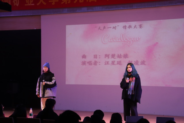 经过初赛的激烈竞争,共有14组选手脱颖而出进入决赛。决赛分为三个部分。比赛中,甜甜的《告白气球》、伤感的《情歌》带着观众进入细腻的情感世界,感受爱情的酸甜苦辣。其中,设计学院陈洪伊和宋柯演唱的《情歌》赢得一片喝彩。中场休息时,设计学院崔冬月、王曦梓、宋禹凝带来的古筝二胡钢琴合奏《女儿情》引起听众共鸣。在互动环节中观众积极参与,为他们喜欢的歌手投票加分。在你放我猜游戏中,各个选手听歌猜歌名,现场气氛热烈,选手们大放异彩。最后在巅峰情歌王环节中,选手们以自己稳定的状态和出色的发挥为在场观众和评委呈现出一场听觉的盛宴。