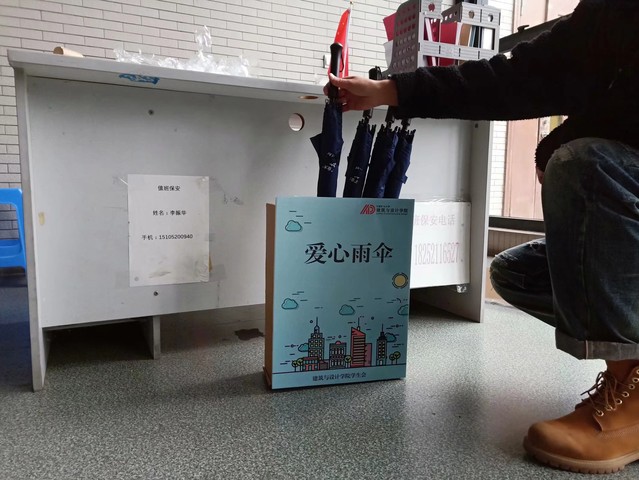 为了方便师生借还,爱心雨伞设立在学院资料室前门和后门处,并分别放置了五把雨伞。师生使用爱心雨伞时需先在《爱心雨伞登记表》上进行登记,登记结束后即可领取使用,事后需放回原位。需要注意的是师生借用爱心雨伞时需确认爱心雨伞完整程度,在使用过程中如遇遗失、损坏等情况应主动赔偿,轻度损坏时则需由使用者自行修复。