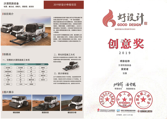1 | 沙漠筑路装备 | 张震 (工业设计工程2018级硕士研究生) | 姚君 张昆 | 2019中国“好设计”奖 | 创意奖 |