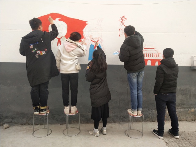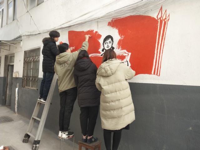 活动之前,在设计学院青春之光青年志愿者协会的帮助下,16级学生党支部提前了解了到和平路社区对美化社区墙面的需求。经过1个小时的车程,同学们到达墙绘地点。办事处的工作人员已经提前准备好了调色盘、颜料、刷子等工具,同学们根据工作人员选定的墙绘图片便投入到墙绘之中。基于16级学生党支部是由环境设计、工业设计、建筑学、音乐学多专业构成,墙绘时,大家分工明确,音乐学的同学负责领取材料,环境设计的同学负责勾勒线条,建筑学和工业设计的同学负责上色。天气寒冷,同学们却专心致志,墙绘过程井然有序。社区居民纷纷驻足围观,询问同学们的学校、专业等情况,并且热心为同学们递上热水。“这些孩子画得真好,跟真的一样,我们社区一下子就变漂亮了。”一位围观的大爷夸赞道。