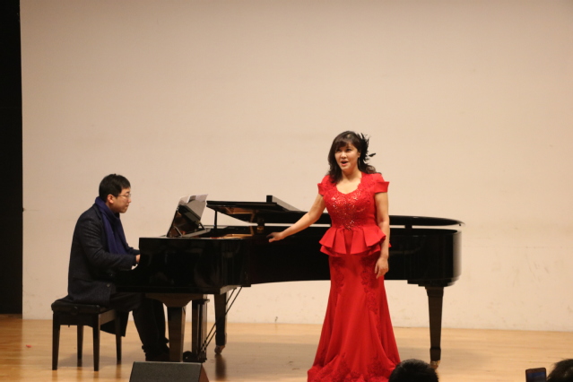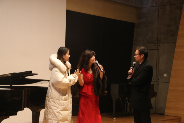 音乐交流会上,金智贤院长盛装出席,献唱了《Let the Bright Seraphim》、《I could have danced all night》两首声乐作品,淋漓尽致地展现了高超的声乐演唱技巧,在场的观众无一不深深地沉醉在这音乐世界里。随后,金智贤院长还指导了两位音乐系学子的声乐作品,从作品的情感的处理及歌唱发声位置等方面进行了详细的点评和教学,使学生得到了深刻的理解。表演结束后,音乐系师生与金智贤院长进行了交流并合影留念,李教授谈到:“本次交流讲学后,希望同学能走出矿大,在外进行深造。”