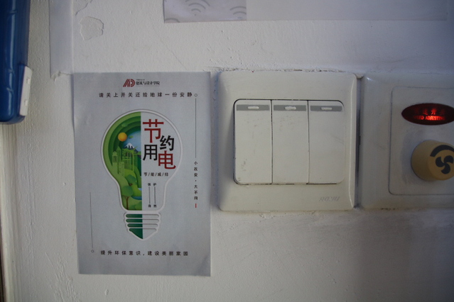 学生会成员在宿舍的电开关旁边张贴了“节约用电”的海报。海报上将灯泡一分为二,一半绿色一半写着节约用电,并且在开灯时正好可以看见,起到了提醒作用。同时,学生会成员还在厕所里贴上了“节约用水”的海报。海报上印着一个未关的水龙头,以及“洗完手随手关闭水龙头”的标语,以此来提醒同学们节约用水。