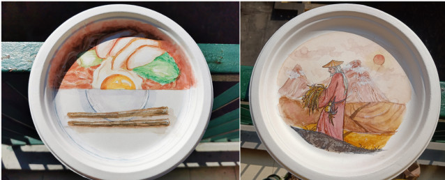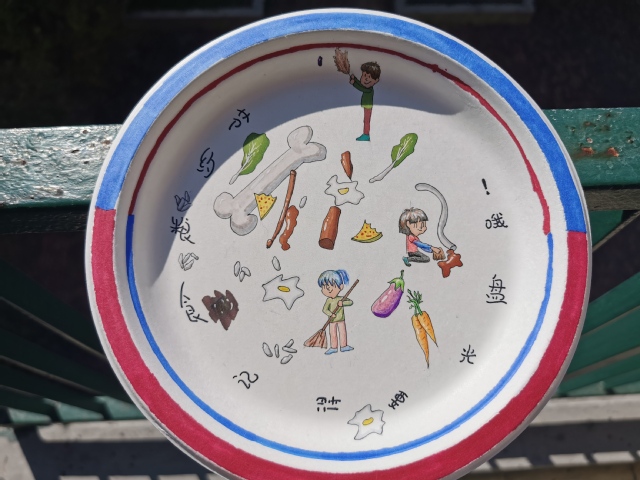 班级共有5名同学提交了精美的纸盘作品。陈越佼提交的作品以光盘前和光盘后的对比,来突出厉行节约,倡导光盘行动的主题。黄山提交的作品主体是一碗特别的米饭,把祖国的大好河山放碗里,象征着光盘行动和祖国未来息息相关,底下那三条锦鲤暗示她对祖国的祝福。范秋影的作品画了一些食物在盘子上,然后画了三个打扫的小人,把盘子里面剩的食物打扫干净,表达了落实光盘行动的主题。潘怡洁的作品绘制了各种食物在盘子里,用筷子分割成两部分,右侧是食物的原材料,左侧是做成各种菜式,表示了一粥一饭来之不易,我们应当勤俭节约的主题。李梦宇的作品中一位农夫深情地看着手中的麦穗,这不仅是他生活的来源,也是他播种的希望,表达了粮食的可贵和勤俭节约的必要性。