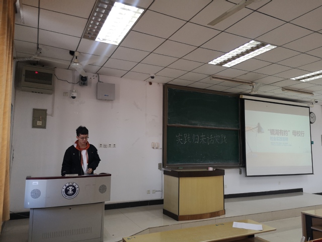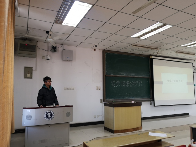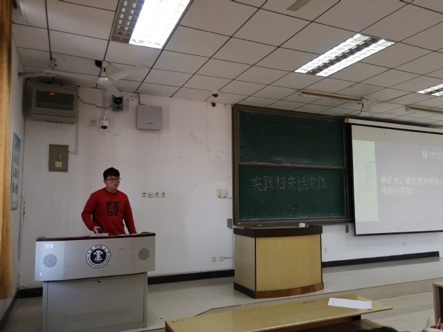 分享会伊始,团支书徐锦添向同学们介绍了本次分享会的流程及其意义。会议由“母校行”和“改革开放40年征文活动”两个部分组成。首先,由熊健钧等四名同学依次向大家展示,ppt中呈现了寒假期间他们回到母校,为学弟学妹们介绍矿大、讲述大学生活以及答疑解惑的情形,另外,他们也分享了“母校行”中遇到的困难与收获。接下来,华倩倩、徐锦添两名同学向大家展示了寒假社会实践的另一部分。华倩倩同学以“改革开放四十周年以来家乡的变化”为实践主题,探寻了浙江温州的畲族乡的变化与进步,向大家展现了新时代当地的建筑和民俗。接着,徐锦添同学对家乡福建三明市沙溪河水的污染治理状况进行了调查,讲述了溪水如何在政策支持、监管加强、全民参与的情况下回归清澈的过程。