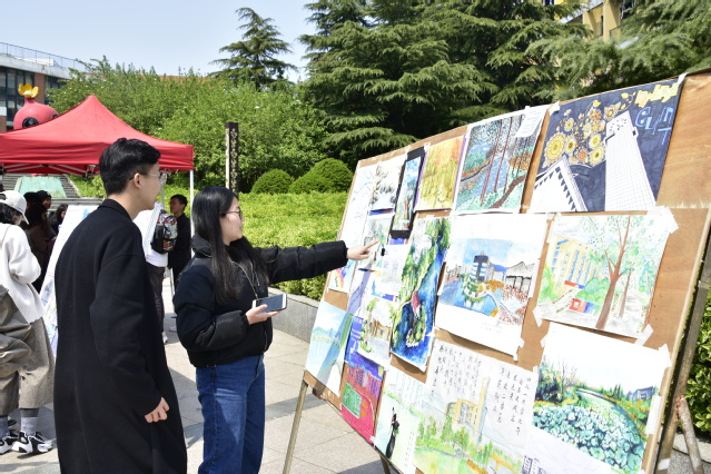 活动伊始,活动负责人刘荷带领志愿者们在规定位置布置场地,并为志愿者们详细讲解了本次投票活动的流程和注意事项。参与活动的作品内容丰富,有倒映着晚霞的镜湖、饱经沧桑的焦作路矿学堂、储蓄着知识的图书馆、湖中成双的黑天鹅,还有教五大草坪的风筝和镜湖大讲堂边的红桥等等。来往的同学们被一张张精心创作的画作所吸引,他们纷纷停下了脚步,认真观赏,并拿出手机拍照留念,并不时提出一些关于画作与活动的问题,志愿者们都耐心细致地给予了解答。同时,志愿者也向同学们详细介绍了本次活动的目的以及活动后续的安排。在得知这些优秀的画作将会在三个食堂广场进行义卖,并将所得资金全部捐赠与敬老院的老人时,同学们对活动给予了高度的赞扬,并纷纷表示会积极参与到活动中去。