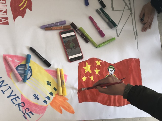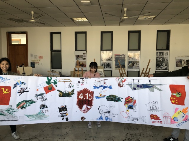 在会上,班长向大家介绍了国家安全的相关知识,并引导同学们维护国家安全,增强安全意识。通过学习,大家纷纷表示维护国家安全是全体学生的重要使命和责任。班会前,同学们通过网络搜索有关国家安全的图片。在团支书王可欣组织下,大家分散在绘图纸的四面,开始思想涂鸦。期间,两位老师也加入同学们,拿起画笔一起创作。本次作品集众多同学的智慧,内容丰富多样,有国旗国徽、飞机航母、士兵武器、领土边界碑等。随着作品的逐步完善,班会也接近尾声,同学们收拾好颜料、画笔等工具,将画室打扫干净,然后拍下与作品的合照。