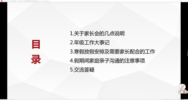 周天涯老师首先说明了大学家长会的意义,接着系统梳理了本学期年级工作的“大事记”,提醒家长要从年级工作中找寻与孩子沟通的共同话题。最后,他详细说明了寒假放假安排,着重讲解了假期间家庭亲子沟通的注意事项,提醒家庭严格落实疫情防控要求,支持孩子利用假期开展自我教育活动。会上,周天涯老师还就家长们关心的问题作了详细解答。